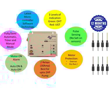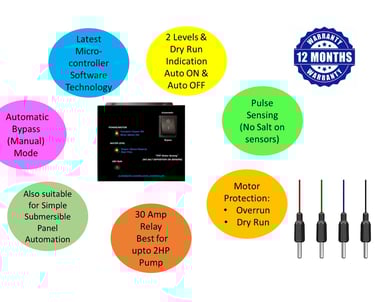 Automatic Water Level Controller (Model - LWT) is based on latest microcontroller technology with pulse sensing technique (sensor cleaning not required).It is primarily used for automation of corporation water supply motor