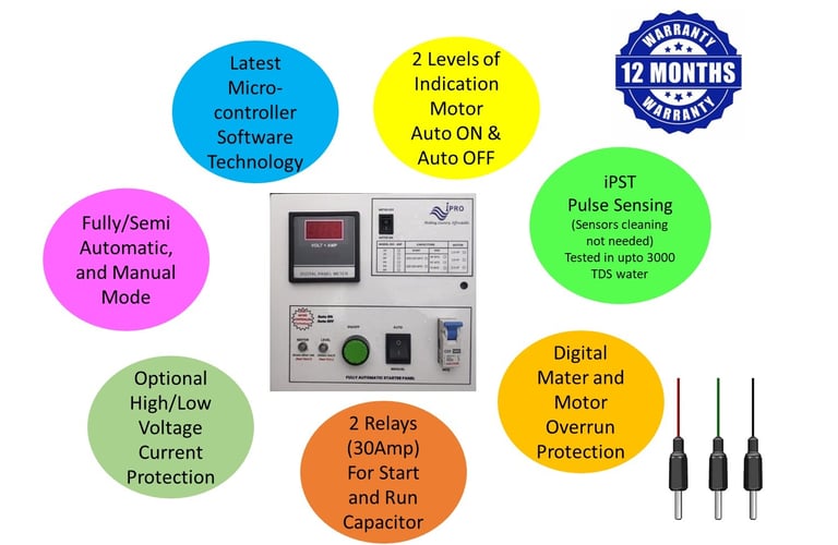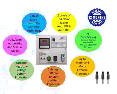 Automatic Starter Panel (Model -ASP) is fully Automatic Starter Panel for Single Phase Submersible Pump. It is based on latest microcontroller technology with pulse sensing technique (sensor cleaning not required). Available for 1HP, 1.5HP and 2HP Submersible Pumps.