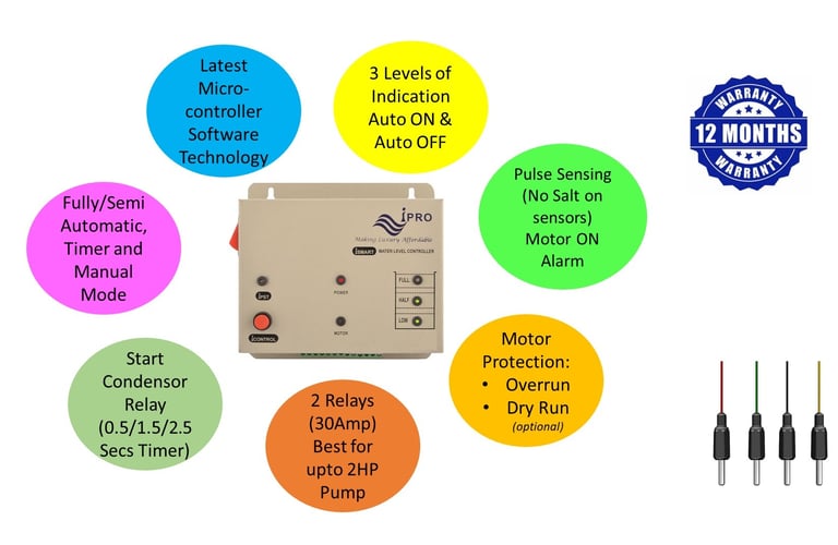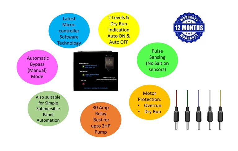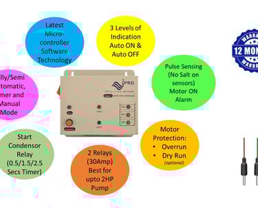Automatic Water Level Controller (Model - AUTO) is based on latest microcontroller technology with pulse sensing technique (sensor cleaning not required). Tested up to 2500 TDS. It is used to automate Single Phase Submersible (Boring) Pump with Single Condenser as well as Double Condenser type Panels.