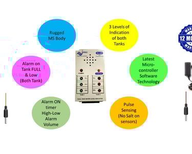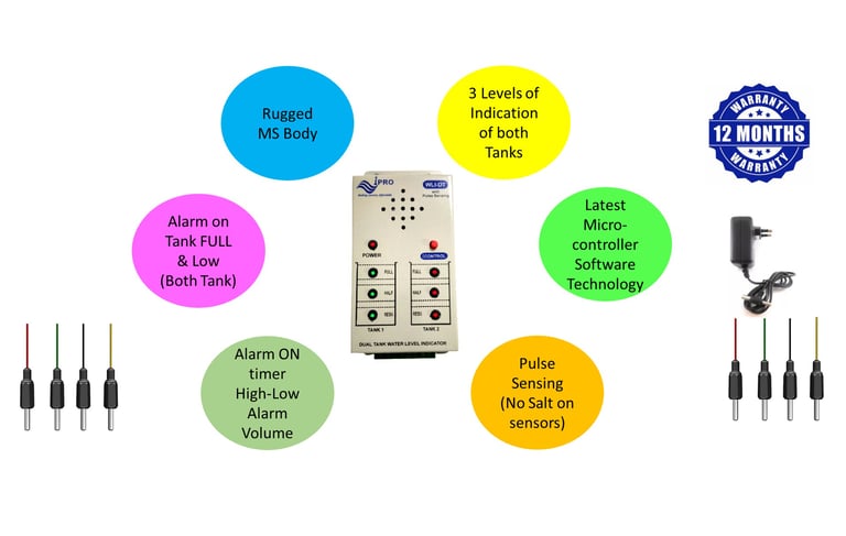 3 Water Level LED Indications for 2 Tanks (Reserve, Half, FULL). Tank 1 Green LEDs and Tank 2 Red LEDs .