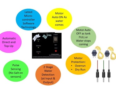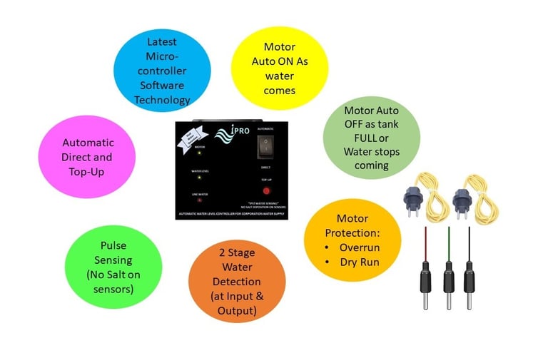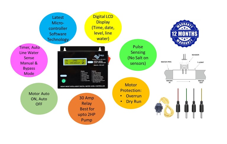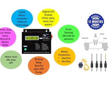 Automatic Water Level Controller (Model - Eco-LT) is based on latest microcontroller technology with pulse sensing technique (sensor cleaning not required). It is primarily used for corporation water automation and have 2 stage water detection (at motor input as well as at water tank).