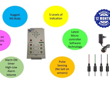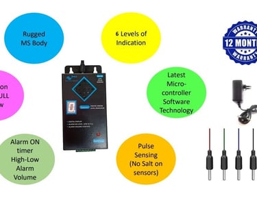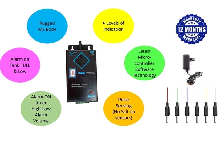 SMC-DI is a 5 Stage Water Level Indicator. SMC-DI offers Digital Seven Segment Display. It gives 5 levels of Indications and unique musical alarms at LOW and FULL levels with an option to select alarm volume and and alarm auto OFF timer. It uses DC adapter as a power supply option, so there is no worry of electric shock, unlike products wherein 220V AC is used for power them ON.