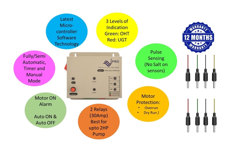 Automatic Water Level Controller (Model - Eco) is based on latest microcontroller technology with pulse sensing technique (sensor cleaning not required).It is primarily used for Underground to Overhead Tanks Automation and Submersible (Boring) Pumps with single condenser type Panels.